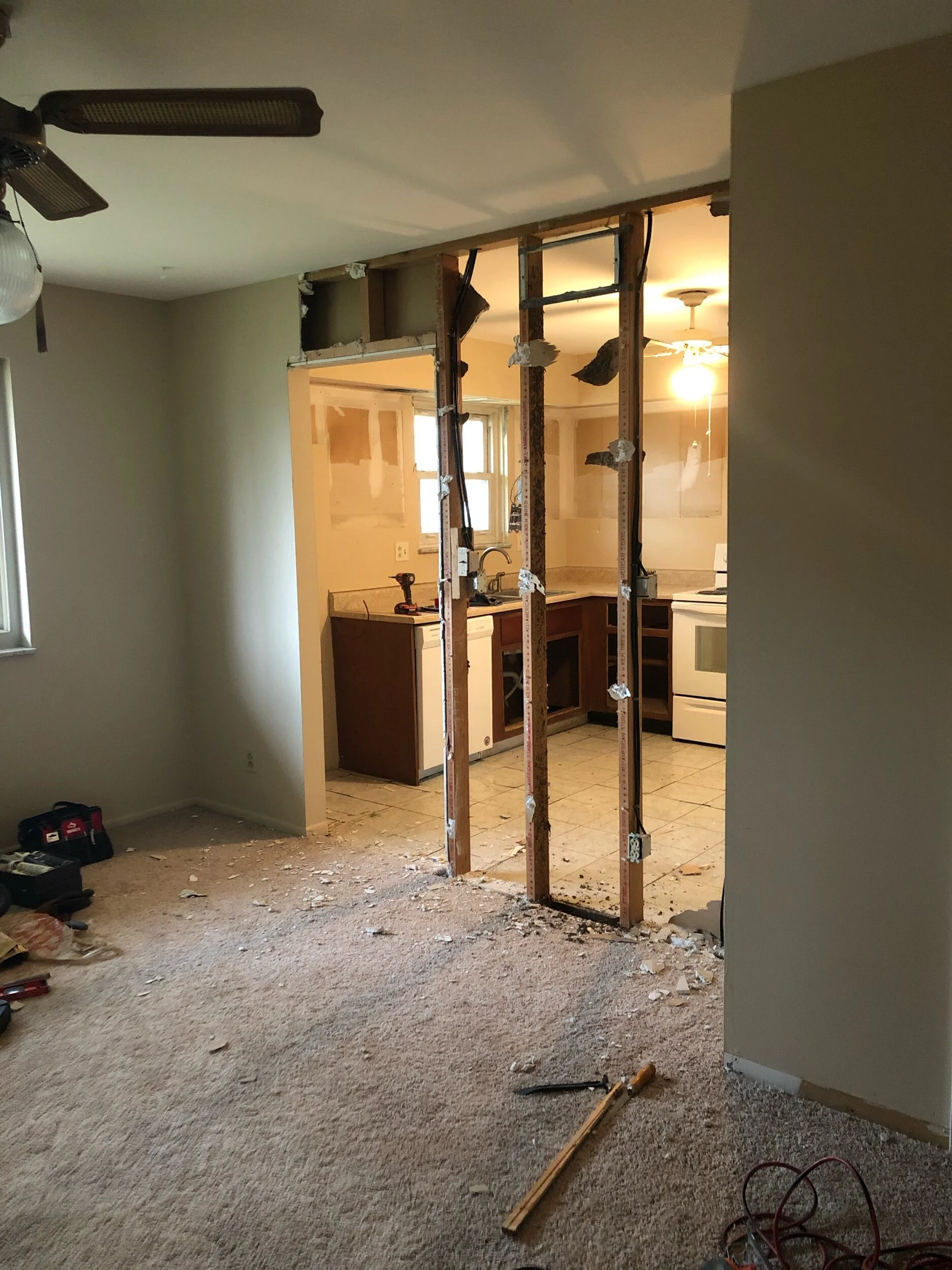 It’s demo day! We wasted no time getting started on demo and the first order of business was to remove the wall separating the dining room from the kitchen. We needed to get an accurate measurement for the peninsula cabinets we have planned to separate the kitchen and the dining room. The cabinets we are ordering are going to take 4-8 weeks to come in and we needed to get them ordered asap.